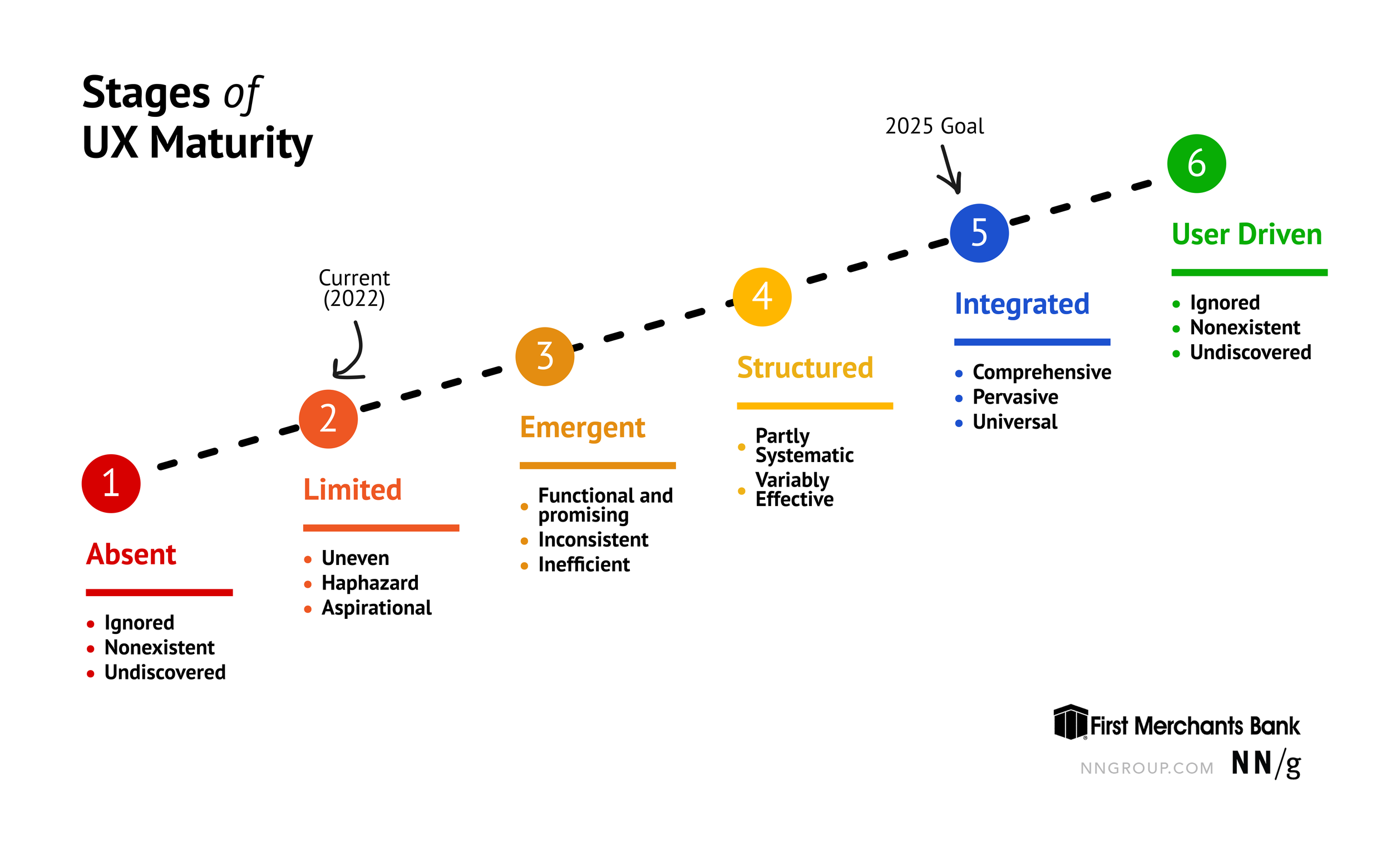 The above image is based of Nielson Norman group’s established stages, and was used for educational purposes at First Merchants Bank.