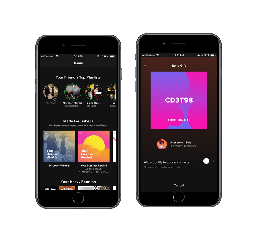 Overall, test subjects were able to navigate through the new features and complete the given tasks. All 3 participants hesitated with upvoting shared playlists. Preferences for a “thumbs up” or a heart icon were stated. The existing upward pointing arrow with the led test subjects to think they’d be scrolling through, or that the number below indicated the number of songs in the playlist. Subjects also struggled with locating the gift sending history, located within settings. Once within settings, subjects had no trouble finding the gift sending history, but finding the setting button itself was a challenge. However, without changing Spotify’s existing navigation, there’s little to be done about this. All users felt that the features were easy to navigate through, and other than the upvote, were intuitive. Overall, test subjects seemed to react more positively to the shared playlists feed rather than the gift sending feature.