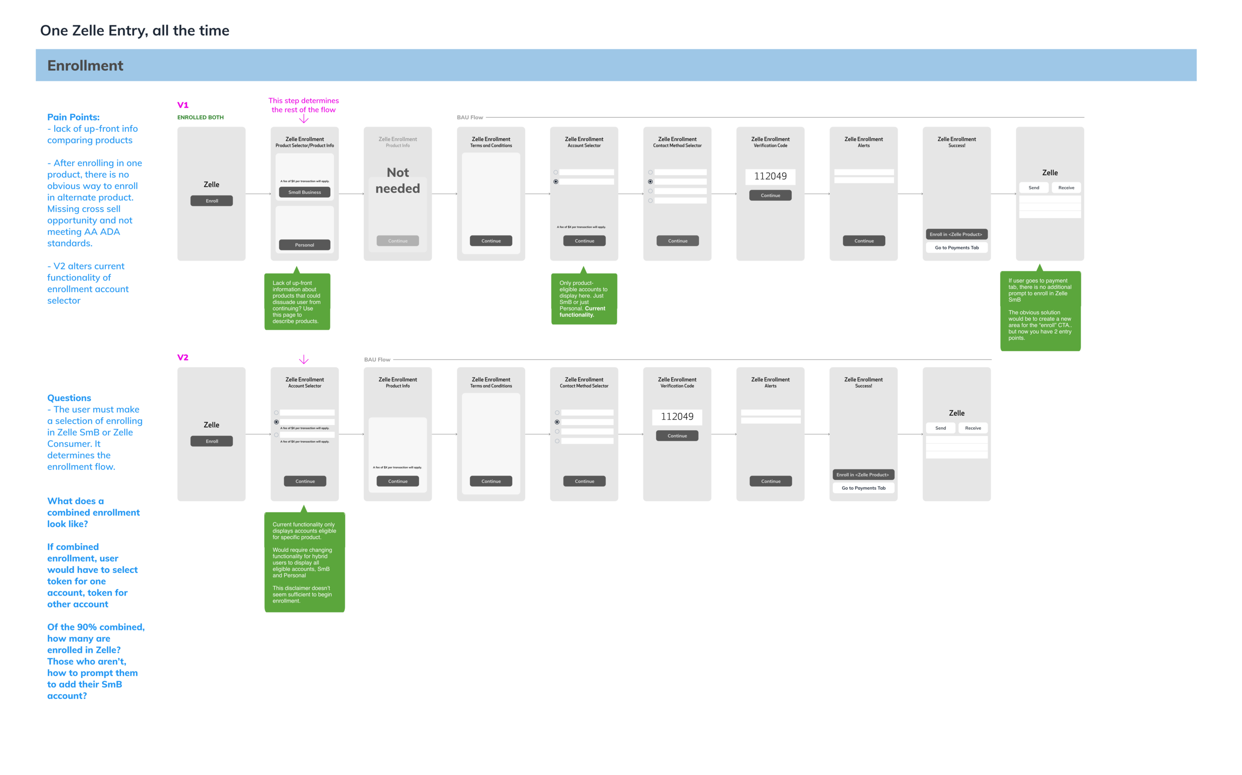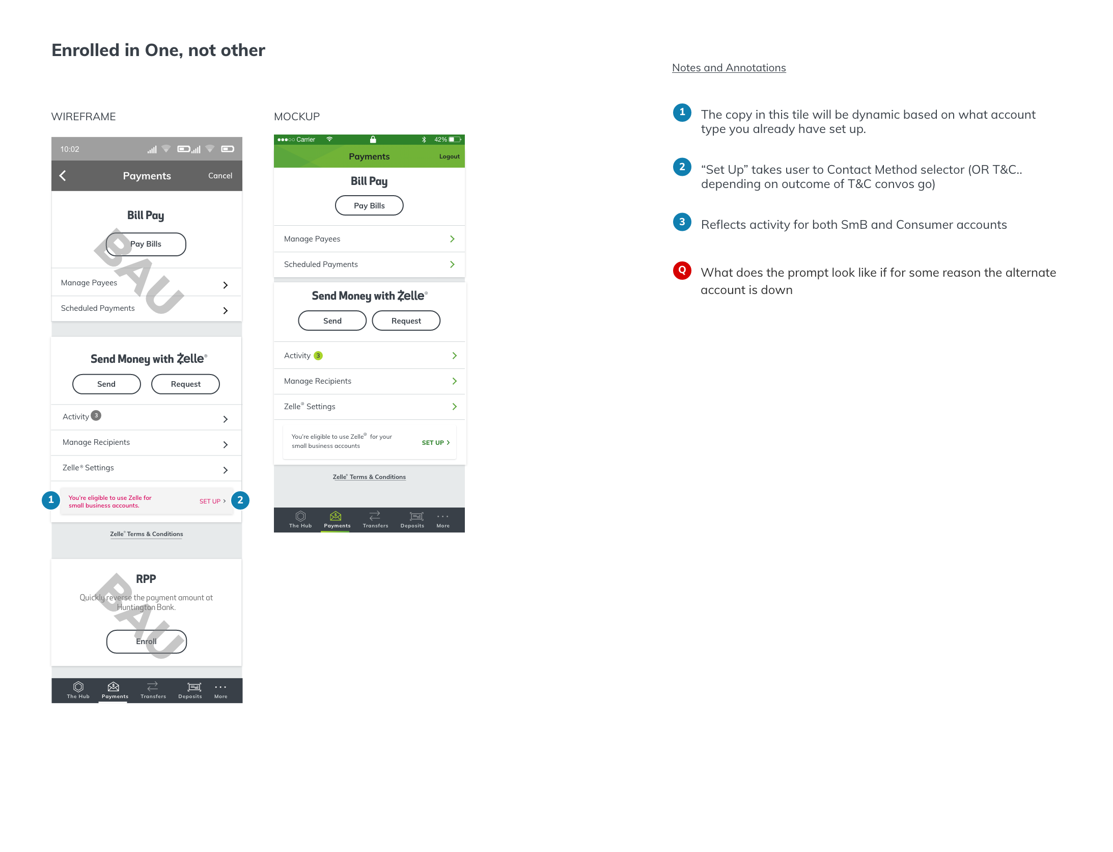 As the style and UI of Zelle was already well established, most of the leg work for this effort was in defining the page flows and architecture. In model 1, above, the hybrid user would click “Enroll” and then have the option to enroll either their business account or personal. This version felt like too much of deviation from the current state, where the user selects the account they wish to pay with, rather than the type of account. That being said, version 2 became the obvious solution. Once the teams all agreed on a path, wireframes came relatively easily.