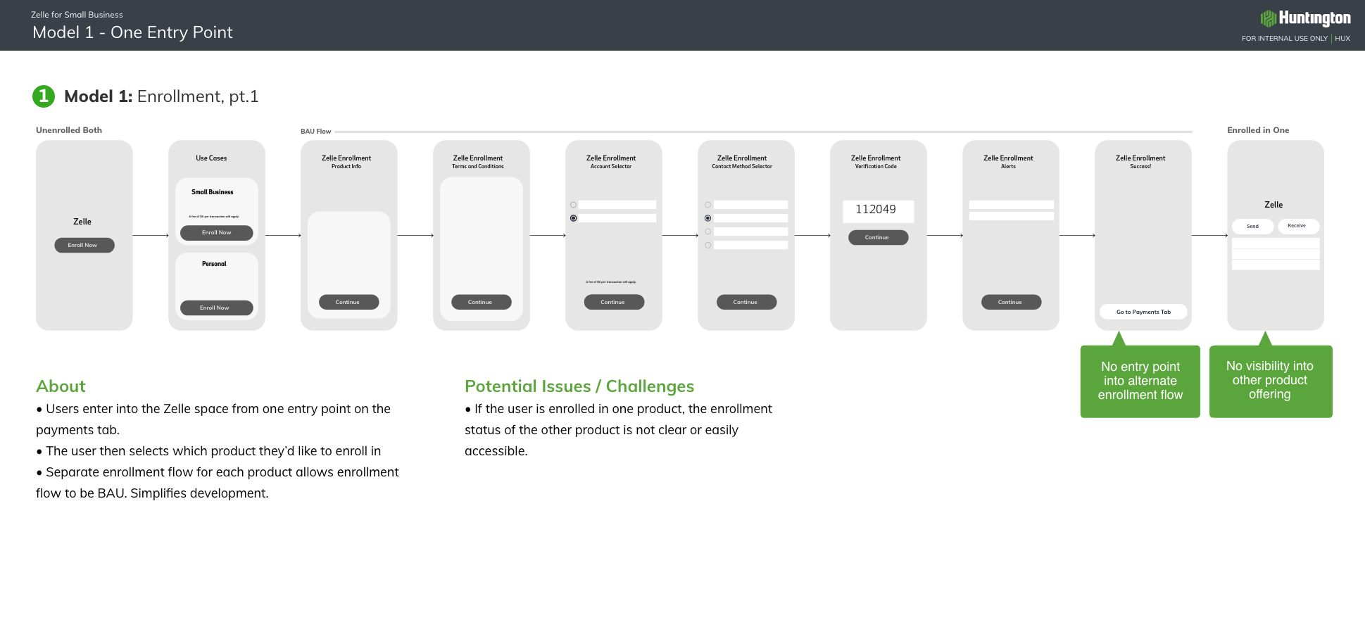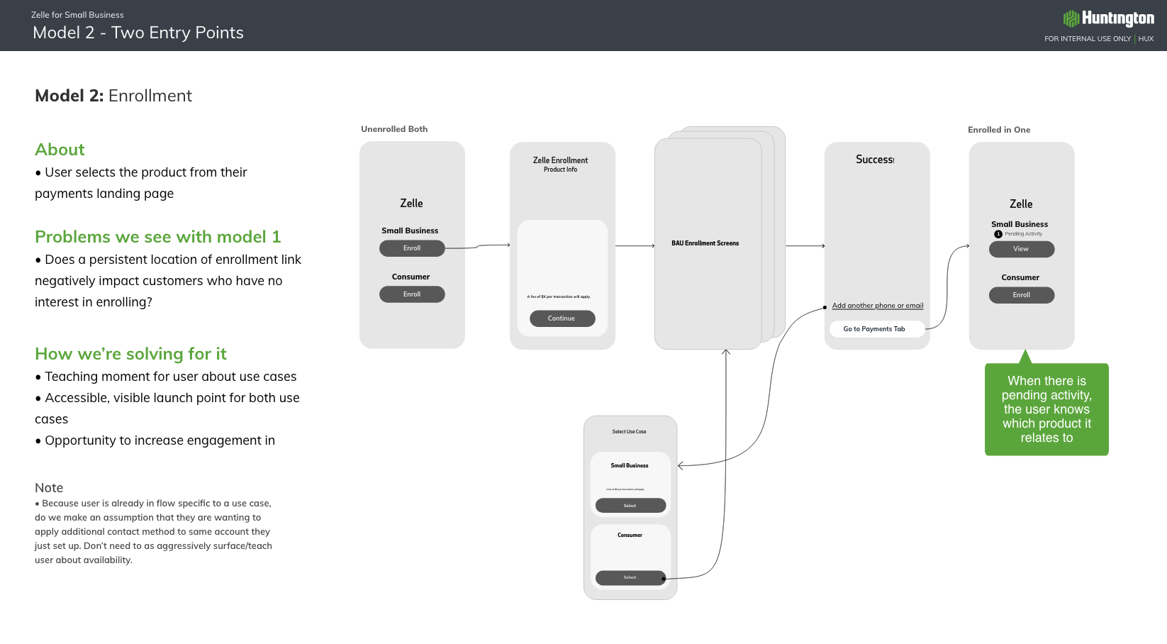 Zelle doesn’t want users to think about Zelle as two separate paths and did not care for model 2. For them, this did not meet the “one entry point” requirement.